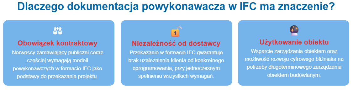 Gdy ostatnia belka zostanie ułożona, a ostatnia linia namalowana, praca wykonawcy jeszcze się nie kończy. Klienci oczekują pełnego cyfrowego przekazania – a tutaj IFC jest formatem z wyboru. W Norwegii publiczni zamawiający coraz częściej wymagają dokumentacji powykonawczej w IFC.