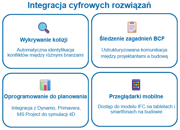 - Łączenie obiektów IFC z harmonogramem (Dynamo, Primavera, MS Project itp.) pozwala tworzyć symulacje 4D.