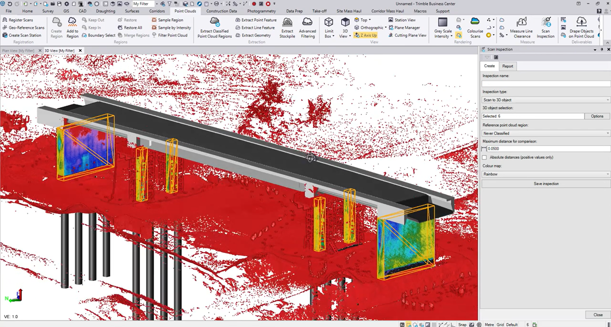 Przykład: Skan 3D mostu może zostać porównany z modelem projektowym, aby zweryfikować położenie filarów lub geometrię przęsła i wykryć odchylenia wykonawcze.